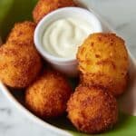 A close-up of seven golden-brown, crispy balls that look crunchy on the outside, placed inside a white square dish lined with green and white striped paper. To the right, a small white bowl contains a thick white dipping sauce, which contrasts with the warm tones of the balls. The dish is set on a white marbled surface. The texture on each ball looks rough with tiny darker spots from frying, showing a crunchy crust. photo taken with an iphone --ar 4:5 --v 7