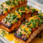The image shows several thick pieces of grilled salmon with a rich, golden-brown sear on the outside and a tender, flaky interior with a pinkish-orange color, arranged in a white dish. Each piece is topped with a glossy, smooth yellow-orange sauce that drips slightly down the sides. Bright green chopped herbs, likely chives, are sprinkled generously on top of both the sauce and the salmon, adding a fresh contrast in color and texture. The dish is set on a white marbled surface, enhancing the vibrant colors of the salmon and sauce. photo taken with an iphone --ar 4:5 --v 7