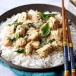 - Serve: Spoon the basil chicken and coconut curry sauce over hot cooked rice and enjoy immediately.