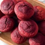 A wooden tray filled with a pile of bright red muffins, each muffin having a cracked, textured top and a smooth, darker red base. The muffins are slightly rounded on top and tightly grouped, showing their soft and moist appearance. The tray rests on a white marbled surface. photo taken with an iphone --ar 4:5 --v 7