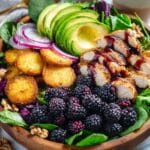This Blackberry Balsamic Grilled Chicken Salad with Crispy Fried Goat Cheese combines fresh, tangy flavors with a satisfying crunch. The vibrant blackberry vinaigrette perfectly complements the juicy grilled chicken and creamy goat cheese for a delightful summer meal.