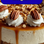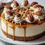 - Assemble and serve: Pour the caramel sauce over the chilled cheesecake. Top with whipped cream and pecan halves for garnish. Slice and serve chilled for the best flavor and texture.