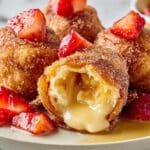 Deliciously crispy Cheesecake Egg Rolls filled with a creamy sweetened cream cheese mixture, fried to golden perfection and rolled in cinnamon sugar. Perfect as a delightful dessert or a sweet snack served with caramel, chocolate, chopped strawberries, or powdered sugar.