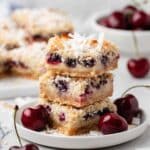 A stack of three square dessert bars sits on a white plate, each bar showing three distinct layers: a light golden brown crumbly base, a middle layer that is creamy beige with visible pieces of dark red and purple cherries, and a top crumbly layer sprinkled generously with white shredded coconut and toasted coconut flakes. Around the plate, fresh dark red cherries with stems rest on a white marbled surface, along with scattered coconut shreds. The background is softly blurred, showing more dessert bars and a white bowl. Photo taken with an iphone --ar 4:5 --v 7