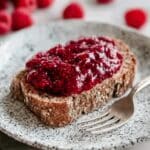 A slice of dark brown seed bread with a rough, grainy texture is placed in the center of a white plate with black speckles. On top of the bread, there is a thick layer of bright red raspberry jam, with visible whole raspberry pieces, giving it a shiny, sticky look. A silver fork is on the right side of the plate, resting gently on the surface. In the background, blurred whole raspberries are scattered on a white marbled surface, adding a soft splash of red. The photo taken with an iphone --ar 4:5 --v 7