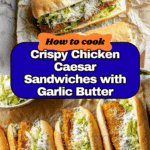 Delicious and crispy Chicken Caesar Sandwiches featuring golden fried chicken cutlets, a homemade Caesar dressing, fresh romaine lettuce, and garlic butter toasted hoagie rolls. This flavorful sandwich offers a perfect blend of crunchy, creamy, and savory elements, ideal for a satisfying lunch or dinner.