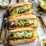 These Chicken Caesar Sandwiches feature crispy fried chicken cutlets layered with a creamy homemade Caesar dressing, fresh romaine lettuce, and garlic butter toasted bread. A deliciously satisfying sandwich perfect for lunch or dinner, combining classic Caesar salad flavors with a crunchy chicken cutlet inside a toasted hoagie or baguette.