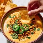 This Chipotle Vegan Queso is a creamy, smoky, and flavorful dairy-free dip perfect for serving with tortilla chips. Made from blended cashews and seasoned with chipotle adobo sauce and a blend of spices, it delivers a rich, cheesy texture without any dairy. Topped with charred corn, jalapeño slices, and fresh cilantro, this vegan queso is an irresistible appetizer or snack that’s easy to prepare and sure to impress.