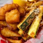 - Serve: Serve the crispy fish and chips with lemon wedges, tartar sauce, or malt vinegar as desired. Include the Parmesan garnished zucchini wedges as a delightful side.