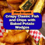 Classic Fish and Chips featuring crispy battered cod or halibut fillets, oven-baked golden potato wedges, and Parmesan-garnished fried zucchini wedges. This comforting British-inspired meal offers a perfect balance of crispy, tender textures and savory flavors, ideal for a satisfying homemade dinner.
