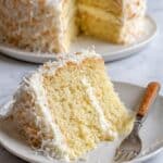 - Decorate with coconut: Place the cake stand on a baking sheet to catch excess coconut. Press shredded sweetened coconut gently onto the sides and top of the cake by hand until the cake is fully covered. Serve and enjoy!