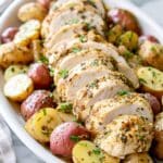 A simple and flavorful Crockpot Turkey Tenderloin recipe paired with tender roasted baby creamer potatoes, seasoned with a blend of herbs and spices for a convenient one-pot meal.