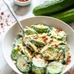 A white bowl filled with a cucumber salad made of many thick green cucumber slices covered in a creamy white dressing. Scattered over the cucumber are thin light yellow cheese shavings and small reddish-brown crumbs, adding texture and color contrast. A silver fork with a piece of cucumber and cheese pierced on it rests inside the bowl. The bowl is set on a white marbled surface with two whole green cucumbers and a small white bowl with more reddish crumbs visible in the background. photo taken with an iphone --ar 4:5 --v 7