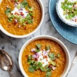 Two white bowls filled with thick orange lentil soup, each topped with a dollop of white yogurt at the center, sprinkled with small pieces of red onion, bright green chopped scallions, fresh green cilantro leaves, and tiny red chili flakes. The bowls sit on a white marbled surface, and to the right, there is a silver spoon with an ornate handle. In the top right corner, part of a small white bowl with a blue patterned rim filled with white yogurt and green scallions rests on a blue textured plate. photo taken with an iphone --ar 4:5 --v 7