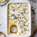 A rectangular white casserole dish filled with a smooth, light cream-colored mixture that covers the entire surface evenly. The top layer is sprinkled generously with small, deep blue and purple dried flower petals, scattered irregularly but covering every part of the creamy surface. The dish is placed on a white marbled texture background, and small bits of the same blue petals are scattered around the dish edges as well. Photo taken with an iphone --ar 4:5 --v 7