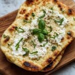 Two flatbreads are stacked on a wooden board, each rectangular with edges browned and slightly blistered from cooking. The top flatbread has a light golden color as the base layer, with white dollops of soft cheese spread evenly across its surface. Thin green ribbons of fresh basil are scattered over the cheese, along with a sprinkle of black pepper and some fine herbs. A single whole green basil leaf sits in the middle, adding a fresh contrast. The background is a white marbled texture. photo taken with an iphone --ar 4:5 --v 7