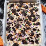A rectangular dessert is shown inside a baking pan lined with parchment paper, filled with one thick layer of creamy white frosting sprinkled densely with broken pieces of black sandwich cookies with orange filling, and small round confetti sprinkles in purple, green, orange, black, and white scattered evenly on top. The pan rests on a white marbled surface with some black lace and orange decorative elements visible on the side. Photo taken with an iphone --ar 4:5 --v 7
