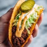 - Serve: Remove the tacos from the griddle. Add the prepared burger sauce, shredded lettuce, chopped onions, and dill pickle chips on top. Serve immediately and enjoy your crispy, juicy smash burger tacos!