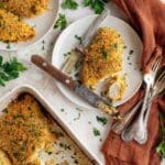 The image shows a close-up of a baked dish with three pieces of golden brown, crispy chicken covered in a crumbly herb crust sprinkled with fresh green parsley. One piece is on a white plate near the center, with a rustic knife and fork resting on the plate, where a small bite is cut showing tender white meat inside. Two more pieces live in a white rectangular baking dish at the bottom left, with some crumbs and baked cheese residue visible. The setting includes a white marbled surface, scattered parsley leaves, and a rust-colored cloth with three silver forks on the right side. photo taken with an iphone --ar 4:5 --v 7