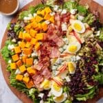 This vibrant Fall Cobb Salad combines roasted butternut squash, crisp apples, savory bacon, hard boiled eggs, and tangy goat cheese atop a bed of mixed greens. Finished with a homemade balsamic maple vinaigrette and crunchy pepitas, this salad offers a delightful balance of flavors and textures perfect for a seasonal lunch or light dinner.