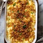 Keywords: French Onion Funeral Potatoes, casserole, hash browns, fried onions, cheesy potato bake, comfort food, baked casserole
