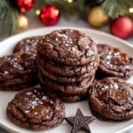 A white plate holds a stack of eight rich, dark chocolate cookies, each topped with melted and slightly glossy chocolate chunks and sprinkled with coarse sea salt crystals, giving a mix of smooth and rough textures. The cookies have a cracked, slightly shiny surface with a deep brown color. One small star-shaped chocolate piece rests on the white marbled surface near the plate. The background is softly blurred with Christmas tree branches and bright red and gold ornaments, adding a festive touch. photo taken with an iphone --ar 4:5 --v 7