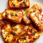 Golden Halloumi with Honey and Thyme is a simple yet elegant dish featuring pan-fried halloumi cheese slices caramelized to a golden brown and garnished with fragrant fresh thyme, sweet honey, and a touch of optional chili flakes for a mild heat. This quick recipe enhances halloumi’s unique texture and salty flavor, perfect as an appetizer or snack, served warm with a crispy exterior and soft inside.
