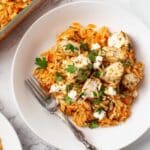 Keywords: Greek chicken orzo bake, baked orzo, Greek chicken casserole, feta cheese bake, Mediterranean chicken dish