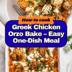 A comforting and flavorful Greek Chicken Orzo Bake featuring tender chicken, creamy feta, spinach, and tangy tomatoes all baked together with aromatic lemon and oregano for a wholesome Mediterranean-inspired meal.