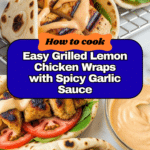 Delicious grilled lemon chicken wraps with a spicy garlic sauce, perfect for a quick and flavorful meal. Tender chicken breast pieces marinated in citrus and spices, grilled to perfection, and served with fresh veggies and a creamy, zesty sauce all wrapped in warm flatbread or pita.