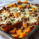 A hearty and nutritious Ground Turkey Sweet Potato Casserole featuring tender ground turkey seasoned with smoked paprika and cumin, layered with boiled sweet potatoes and fresh vegetables, then baked with a savory cheese topping for a warm, comforting meal.