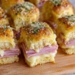 Keywords: Ham and Swiss Sliders, Hawaiian rolls, party appetizer, baked sliders, ham sandwiches, cheesy sliders