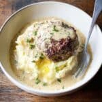 The dish shows two layers on a white shallow bowl. The bottom layer is mashed potatoes, creamy and pale yellow with melted butter pooling in the center and small green herb sprigs sprinkled on top. Above the mashed potatoes, there is a thick meat patty with a dark brown, grilled surface partially covered by a creamy, light beige sauce with visible herbs. The sauce spreads out around the mashed potatoes and meat, pooling slightly on the edges. A metal fork sits on the right side of the bowl, partially submerged in the sauce, and the bowl rests on a wooden surface. photo taken with an iphone --ar 4:5 --v 7