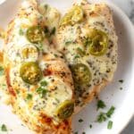 Two pieces of chicken breast are laid on a white plate; each piece is covered by a melted layer of creamy white cheese with browned spots, decorated with slices of green pepper rings scattered on top. The chicken itself shows a light golden and seasoned texture with visible black pepper and herbs. Small bits of green parsley are sprinkled around, adding a fresh look on the white marbled surface underneath. Photo taken with an iphone --ar 4:5 --v 7