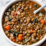 Keywords: lentil soup, spinach soup, slow cooker soup, vegetarian soup, healthy soup, lentils, comfort food, easy soup recipe