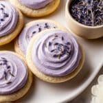 - Frost Cookies: Once the cookies are fully cooled, spread about 1 tablespoon of lavender cream cheese frosting evenly over each cookie using a mini offset spatula for precise application.