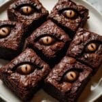 Keywords: brownie bites, monster brownies, Halloween dessert, fudgy brownies, candy eyeballs, spooky treats