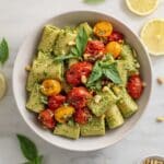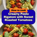 A vibrant and creamy vegan pesto rigatoni recipe featuring roasted cherry tomatoes, a rich blend of cashews, pine nuts, fresh basil, and nutritional yeast. This dish combines the comforting bite of rigatoni pasta with a luscious, dairy-free pesto sauce and the sweet burst of oven-roasted tomatoes, offering a delicious and wholesome Italian-inspired meal perfect for any occasion.