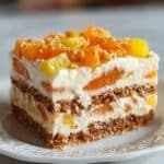 The image shows a square piece of dessert with multiple layers. At the base, there is a thick crumbly brown layer that looks like crushed cookies or graham crackers. Above it, there is a thick creamy white layer mixed with small chunks of orange, soft-looking fruit pieces. This pattern repeats, with another crumbly brown layer and then another creamy white layer with the orange chunks. The topmost layer is mostly creamy white, sprinkled with larger pieces of orange fruit and what seems to be small yellow chunks, creating a colorful and fresh look. The dessert is placed on a white plate with delicate patterns, set on a white marbled surface. photo taken with an iphone --ar 4:5 --v 7