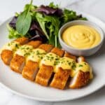 A white plate on a white marbled surface holds a crispy, golden-brown fried chicken breast sliced into six thick pieces, each piece covered with a smooth, bright yellow sauce, sprinkled with chopped green herbs. Alongside the chicken is a small round bowl filled with the same yellow sauce. Behind the bowl, there is a small mixed green salad with different shades of green and some purple leaves. The plate is arranged to show the texture of the crunchy chicken and creamy sauce clearly. Photo taken with an iphone --ar 4:5 --v 7