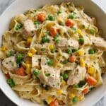 Keywords: chicken pot pie pasta, creamy chicken pasta, easy weeknight dinner, one-pan chicken meal, quick chicken recipe