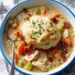 This Roast Turkey & Herbed Dumpling Stew is a comforting and hearty one-pot meal perfect for using up leftover roast turkey or rotisserie chicken. Simmered with a medley of vegetables and fragrant herbs, then topped with fluffy, herbed dumplings, this stew combines rich homemade or store-bought turkey stock with fresh ingredients for a warming, savory dish that’s perfect for chilly days.