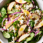 A fresh and vibrant spinach salad featuring a tangy homemade vinaigrette, crisp apple slices, red onion, creamy feta, and toasted almonds. This easy-to-make salad offers a perfect balance of flavors and textures, ideal for a light lunch or a healthy side dish.