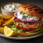 Keywords: salmon burger, healthy burger, seafood burger, pan-fried salmon, omega-3 recipes, healthy dinner, high protein meal