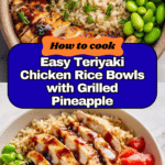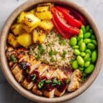A flavorful and healthy Teriyaki Chicken Rice Bowl featuring marinated and grilled chicken breasts served over brown rice with charred pineapple, red bell pepper, and edamame, all drizzled with a homemade glossy teriyaki sauce. This recipe balances sweet, savory, and tangy flavors with a delightful grilled smoky finish.