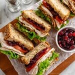 - Finish and Serve: Place the cranberry sauce-covered slices atop the assembled sandwiches, press gently, cut each sandwich in half, and serve immediately for best taste and texture.